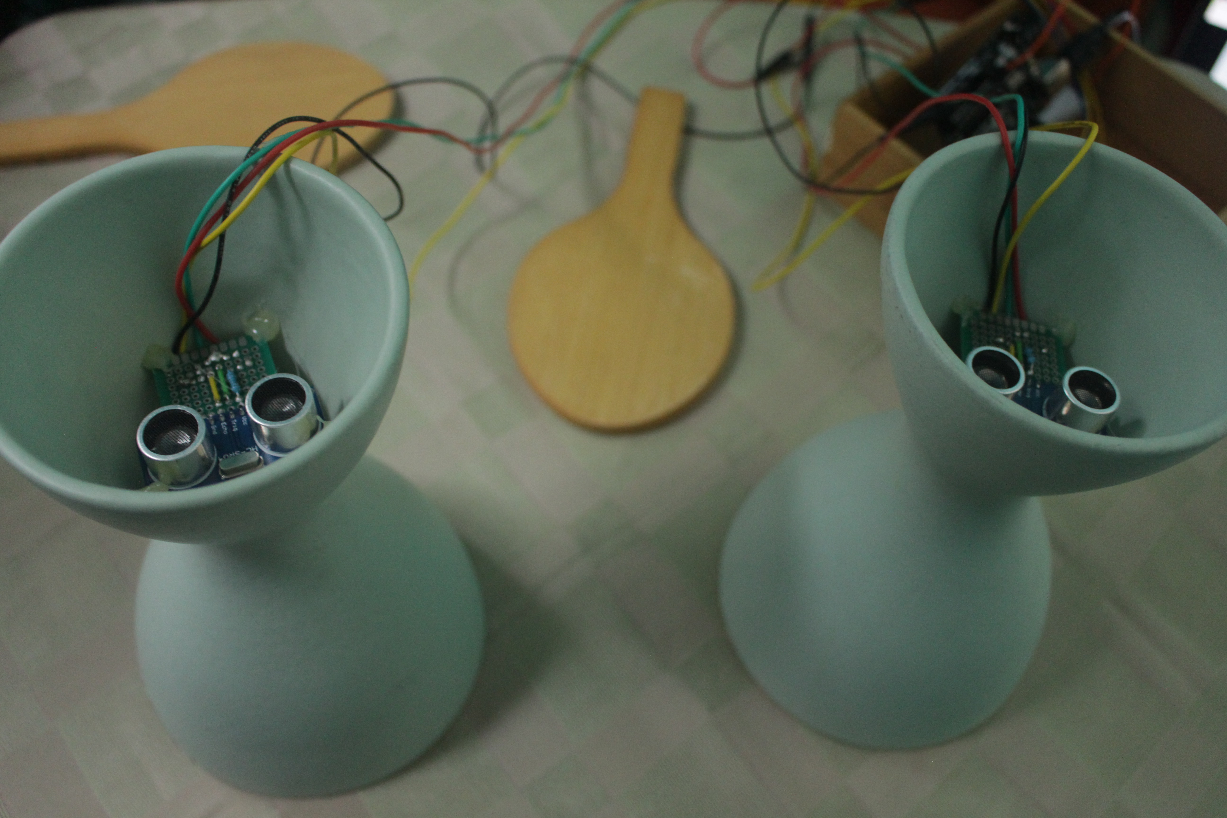Play it by moving two paddles around in the air to control the volume and playback speed of an audio sample. Mounted ultrasonic sensors use the distance of the paddles to change playback in real time.